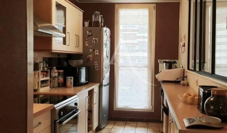 La cuisine équipée avec électroménagers s'ouvre sur un balcon de 7 m2 offrant une vue dégagée sur un espace vert agréable.