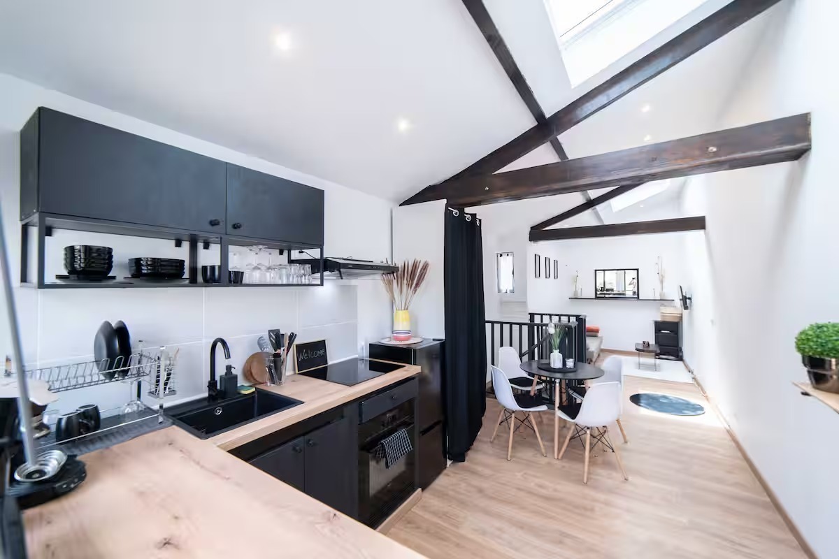 - une cuisine ouverte entièrement équipée (four, micro-ondes, lave-vaisselle, rangements),