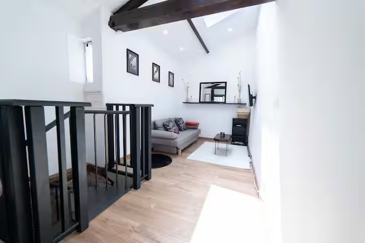 - un séjour lumineux avec belle hauteur sous plafond et poutres apparentes, ouvrant sur un balcon,